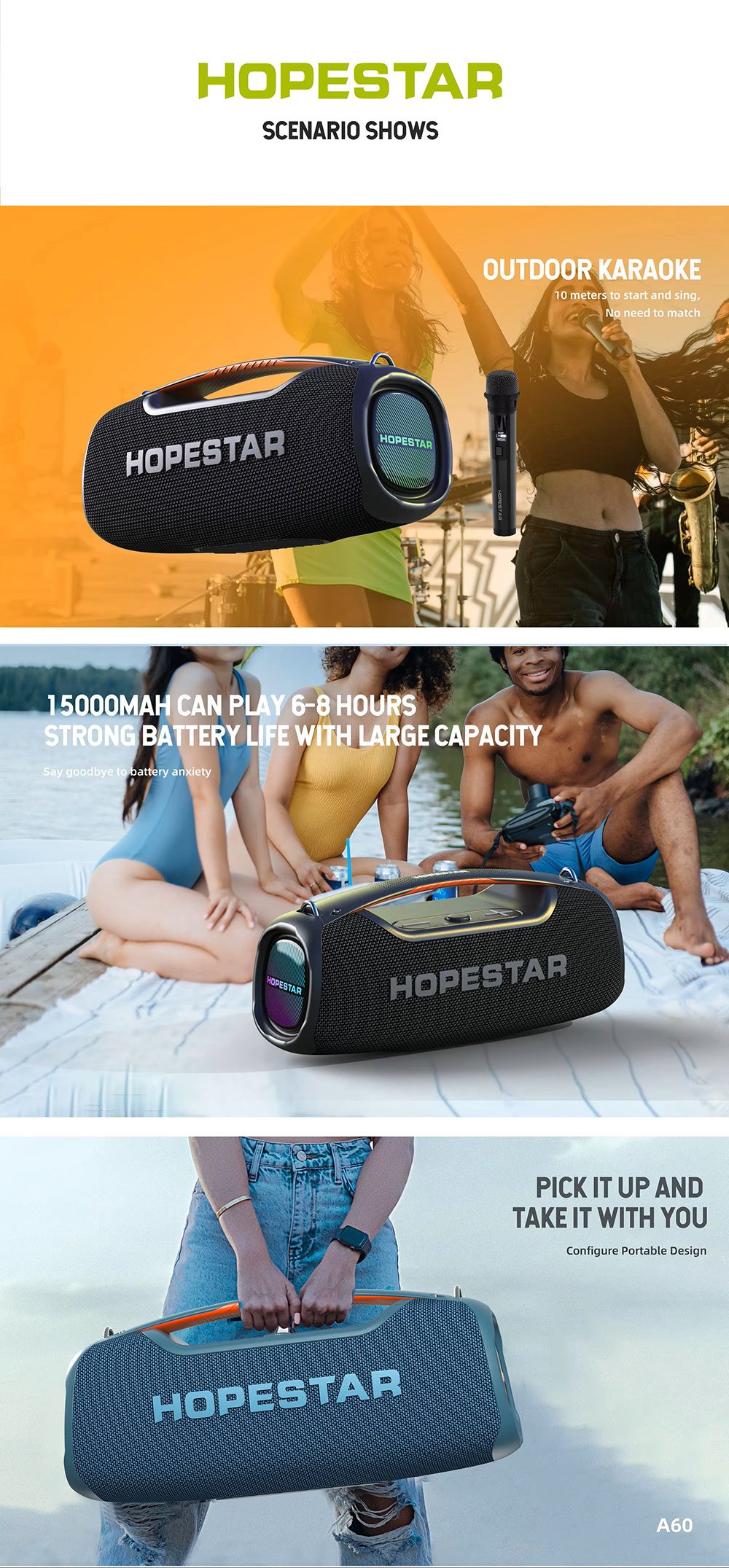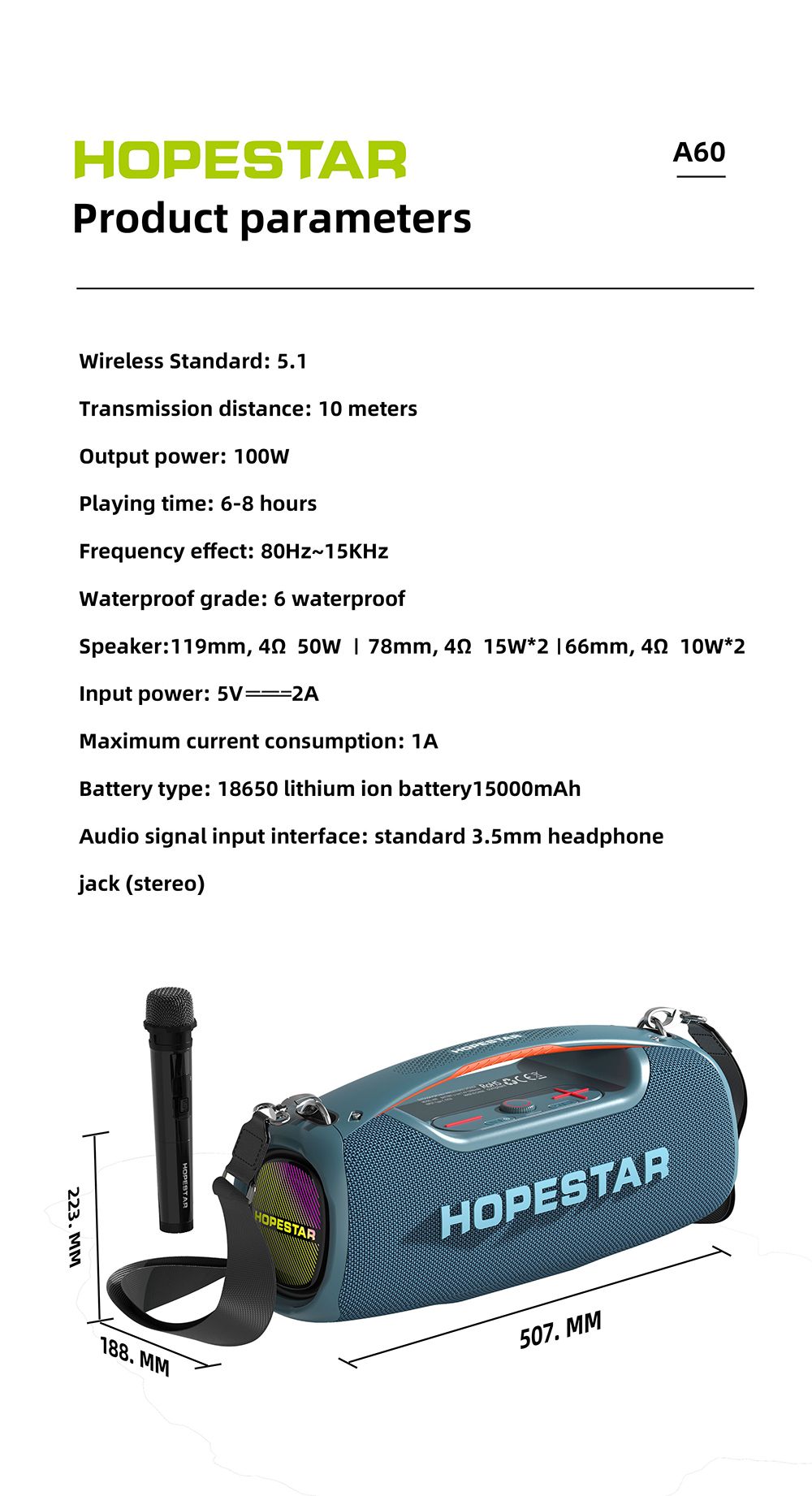 The Hopestar A60 100W portable speaker delivers powerful 3D HIFI stereo sound with a 5-speaker setup, including a 119mm woofer, two 78mm baritone horns, and two 66mm tweeters. It features IP67 waterproof and dust-proof protection, ensuring all-weather usability indoors and outdoors. Bluetooth 5.1 provides strong signal transmission and low energy consumption, supporting multiple playback modes like SD card, USB, and AUX. The built-in 15000mAh battery offers 6-8 hours of playtime at medium volume, and the speaker includes a wireless microphone with a 10-meter range for karaoke enthusiasts.